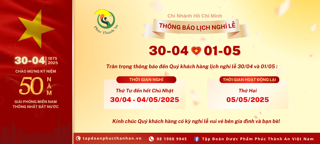 Tập Đoàn Dược Phẩm Phúc Thành An Việt Nam – Chi nhánh Hồ Chí Minh xin trân trọng thông báo lịch nghỉ lễ nhân dịp Ngày Giải phóng miền Nam 30/4 và Quốc tế Lao động 01/05 như sau: